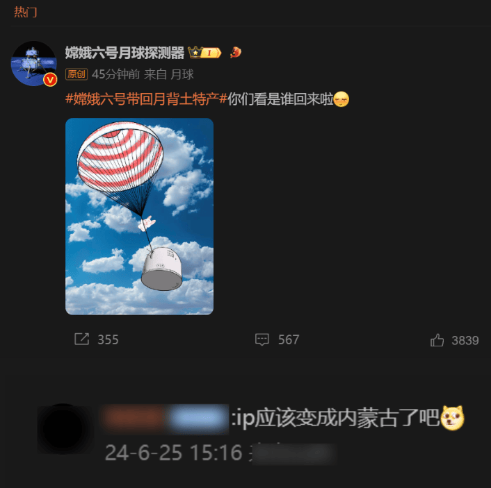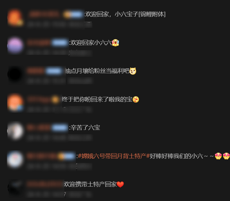 不少網友直接跑到嫦娥六號的官方微博下圍觀,紛紛慶祝小六帶着土特產的順利迴歸。