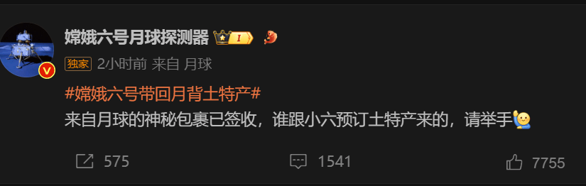 接下來的事情,大夥也都知道了,飛了 20 來天,嫦娥六號終於回到家。落地之後,嫦娥六號也沒閒着,立馬就發了個微博,來徵集預訂月壤的名單。