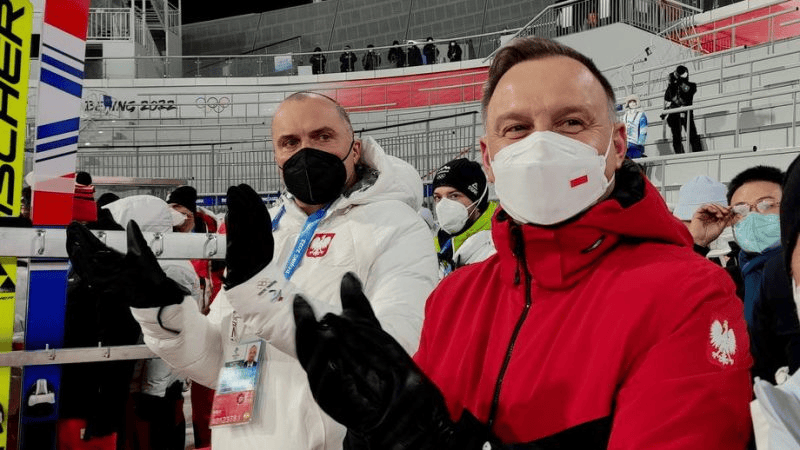 ▲2022 年 2 月 6 日,杜達(右)在中國張家口國家跳台滑雪中心觀看北京 2022 年奧運會男子跳台滑雪首輪比賽時鼓掌。