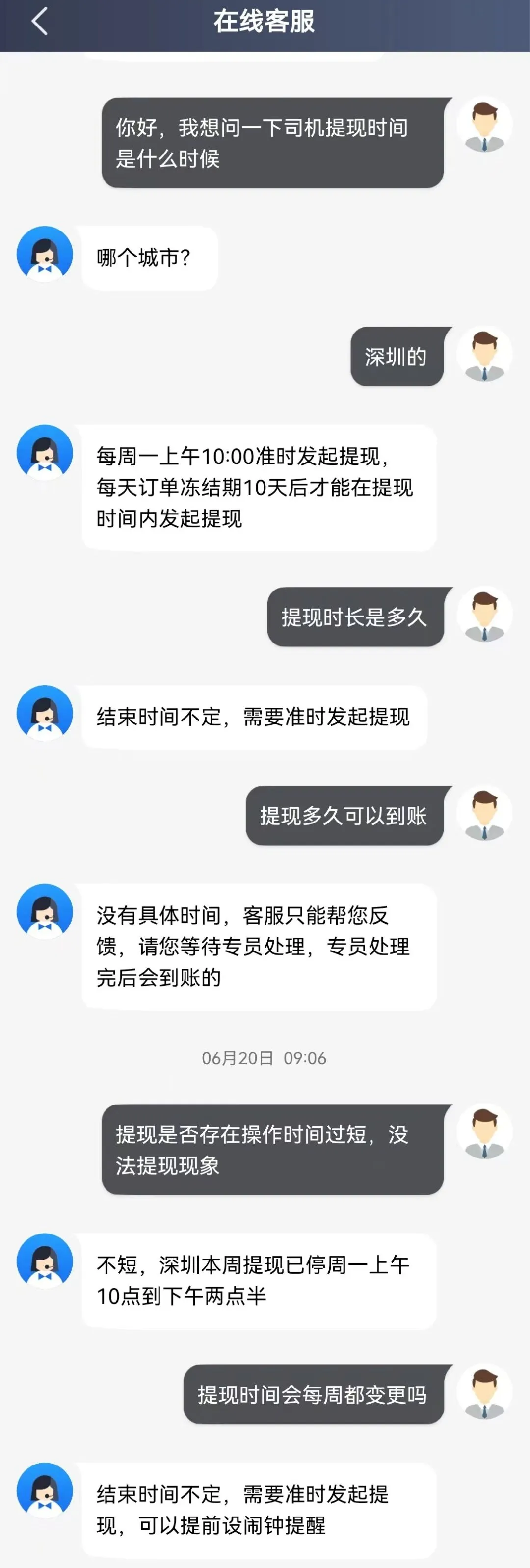記者聯繫斑馬快跑平台客服得到的答覆是,提現時間根據城市不同而有所區別,以深圳市為例,每週一上午10點準時提現,訂單凍結期為10天。提現操作時長不確定,需要司機設置鬧鐘準時發起提現,到賬也沒有具體時間。