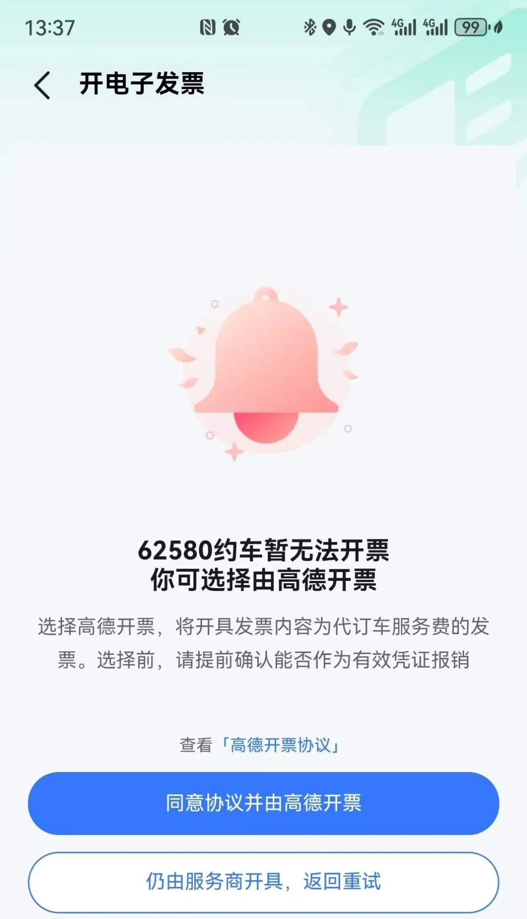 “高德本身具有開具發票的税務登記和開發票能力,62580約車和聚合平台屬於合作關係。可以由高德代開發票,而且代開發票説明是彈窗直接彈到屏幕上,屬於明確告知。”一位律師認為,目前來看,代開發票屬於合法行為。
