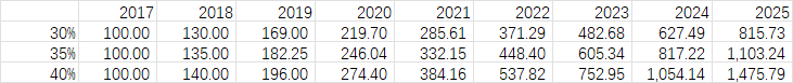 九牧2017年銷售額破100億,咱們以百億為基數來算,如果每年增長35%左右,九牧確實可以在2025年完成千億。
