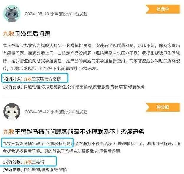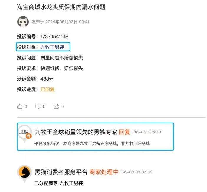 有個網友在淘寶買了九牧水龍頭,產品在保質期內漏水,不久前,這位網友通過黑貓消費者平台投訴,把投訴對象選成了: