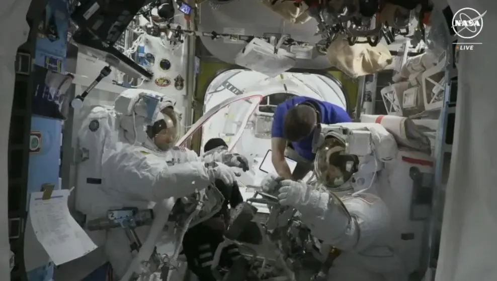 據美國“太空”網站當地時間6月24日報道,由於宇航服冷卻裝置出現漏水問題,兩名駐紮在國際空間站的美國宇航員當天放棄了出艙維護計劃。美國國家航空航天局(NASA)表示,這次太空行走原定於美國東部時間24日上午開始,持續約6.5小時,宇航員將出艙取回通信天線上一個故障零件並採集微生物樣本。結果,宇航員串號宇航服,打開氣閘艙門整準備出去,結果就出問題了,當戴森斷開連接宇航服的維修和冷卻臍帶管(SCU)時,漏水問題發生了。戴森説:“到處都是水……我可以看到冰晶在那裏流動,就像造冰機一樣,那個端口結冰了。”