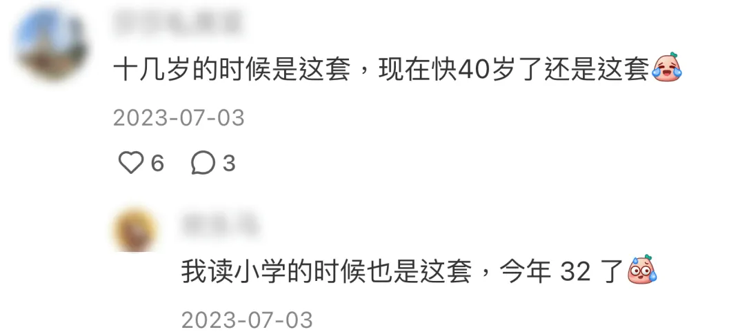 有人穿上它,自動聯想起當時的聲音和味道,課桌下和同桌分享耳機聽的林俊杰的《修煉愛情》,後一排同學寫字沙沙的聲音,約閨蜜拍校服大頭貼後一起買杯皇茶坐在店裏吹水……