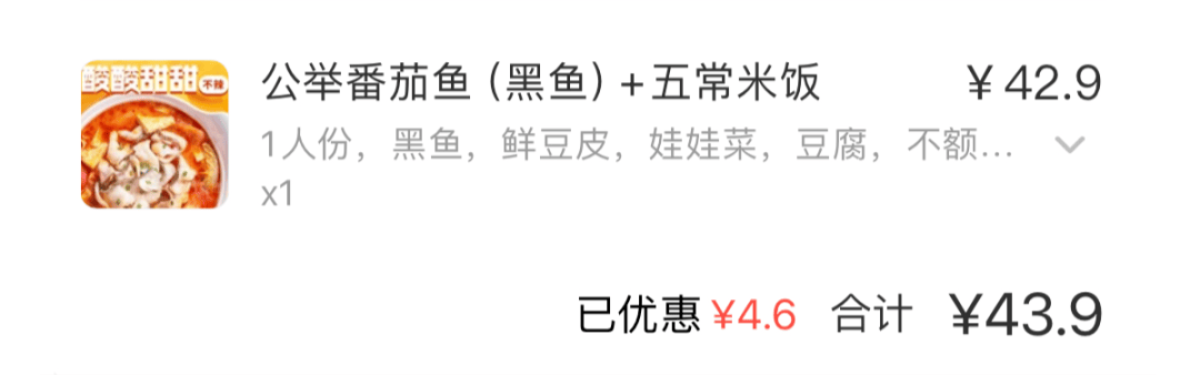 一份酸菜魚(含150g黑魚)價格43.9元,
