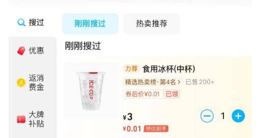 除了基本的套餐,雅雅還發現,餓了麼今年特意設計了迎合夏日看球的小細節:在便利蜂以及其他商超買酒的時候,有1分錢就可以換購的冰杯,“我覺得這種活動的設計非常貼心,因為我不常喝冰的東西,家裏沒有冰塊,這種一次性的冰杯通常原價都在3-5元,又覺得不太划算,現在湊單1分錢就可以買到,幾乎等於免費送了,又實在又不浪費。”
