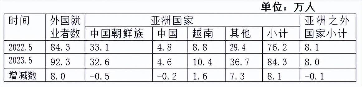 而韓國統計廳、法務部發布的《2023年在韓外國人居住及僱傭狀況調查報告》,有92.3萬外國人在韓國就業。