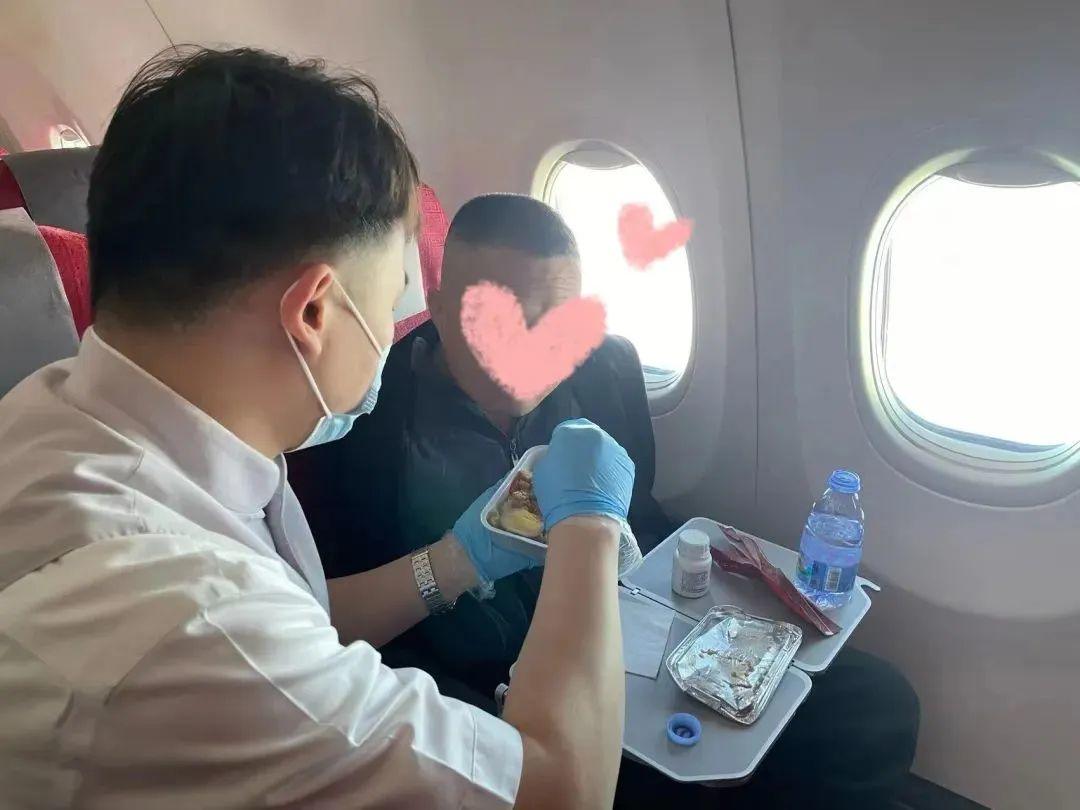 乘務員放下手頭工作,來到這位身邊,端起熱食,一勺一勺喂到旅客嘴裏。