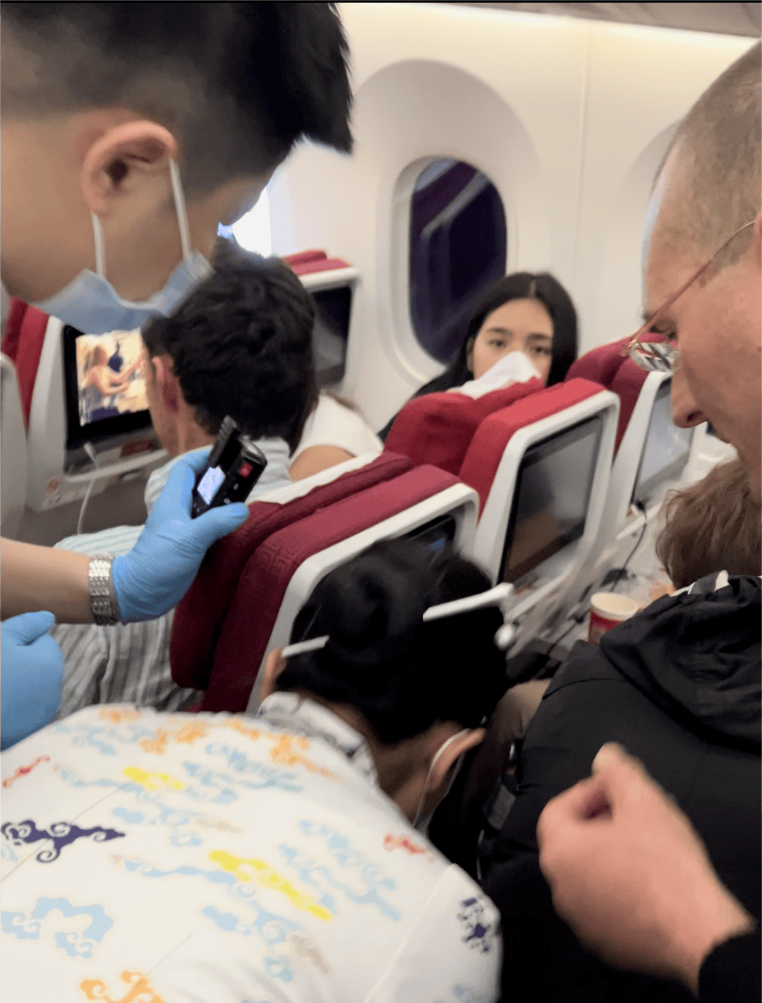 張女士旁坐着一位醫學教授李女士,見狀立刻挺身而出,與此同時,乘務員馬上將這個情況同步給其他組員,機上急救程序即刻展開。