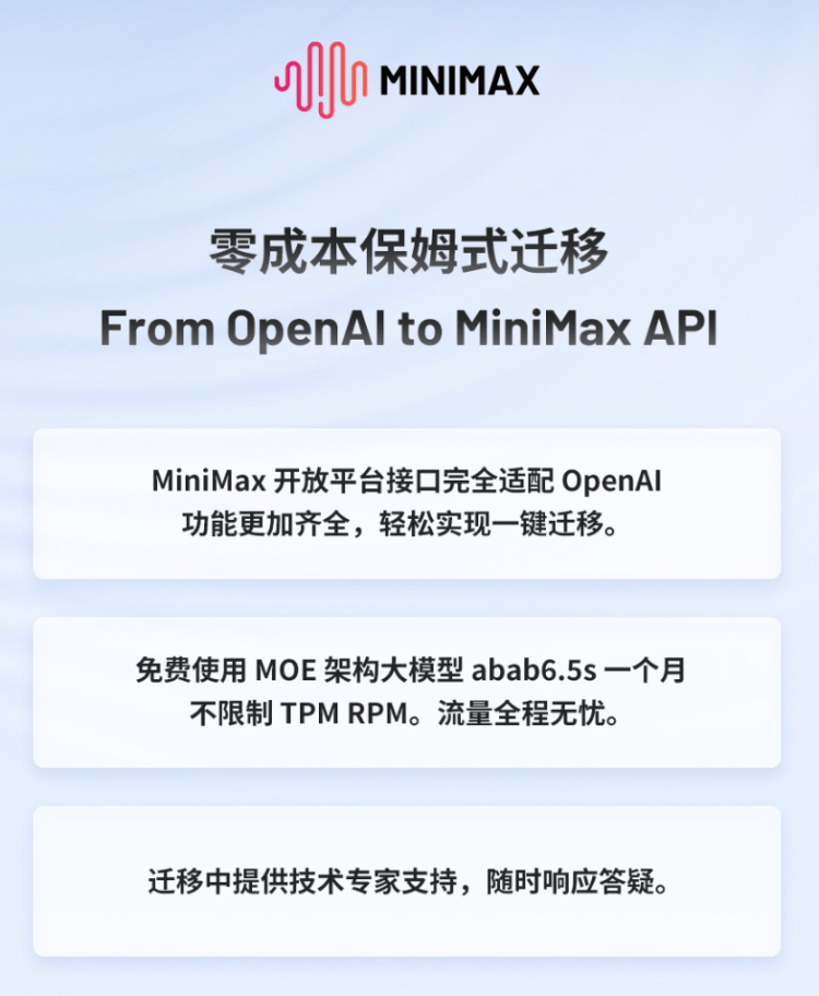 MiniMax 推出零成本保姆式遷移方案,開放平台接口完全適配 OpenAl,可實現一鍵遷移,並可以免費使用 MOE 架構大模 abab6.5s 一個月,不限制 TPM RPM。遷移中提供技術專家支持,隨時響應答疑。
