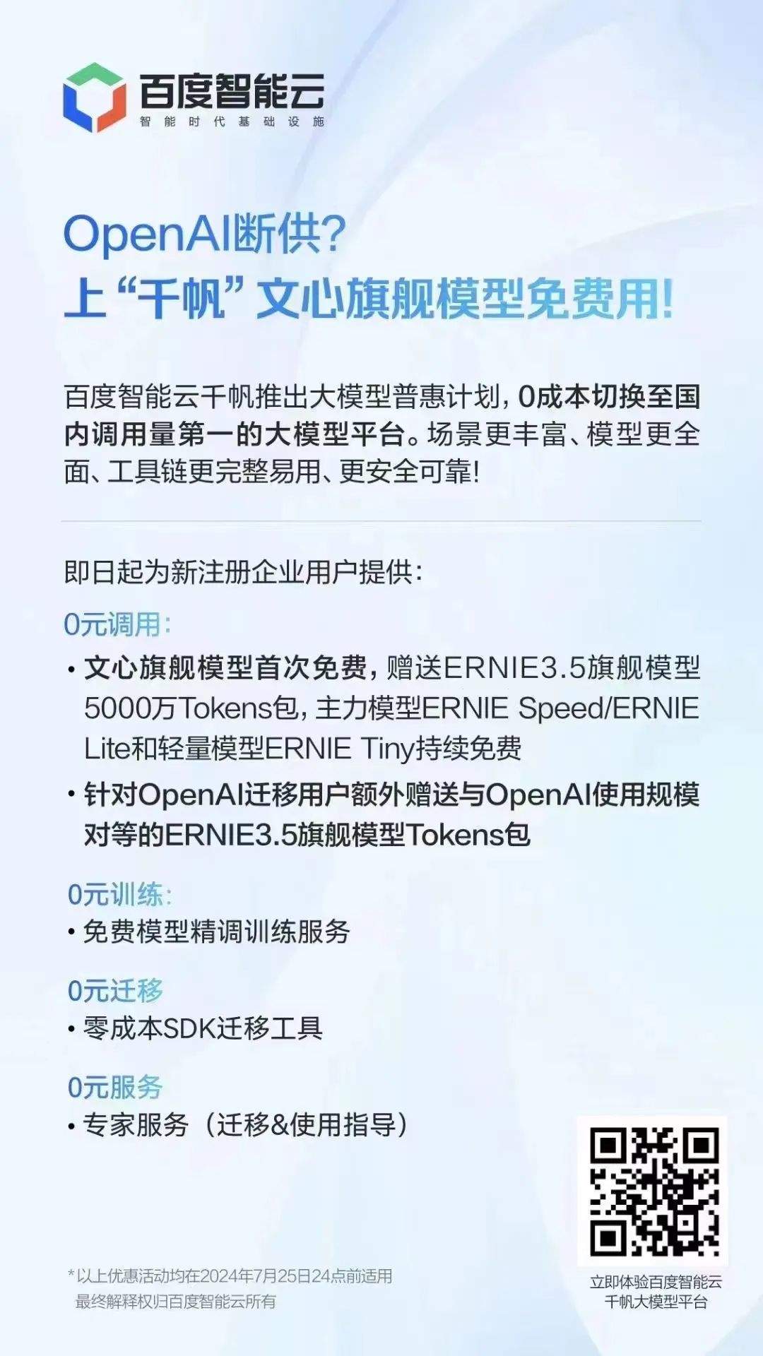 百度智能雲千帆也今天宣佈推出大模型普惠計劃,宣稱支持 0 成本切換至國內調用量第一的大模型平台。即日起為新註冊企業用户提供 0 元調用。其中文心旗艦模型首次免費,贈送 ERNIE 3.5 旗艦模型 5000 萬 Tokens 包,主力模型 ERNIE Speed/ERNIE Lite 和輕量模型 ERNIE Tiny 持續免費。針對 OpenAI 遷移用户額外贈送與 OpenAI 使用規模對等的 ERNIE 3.5 旗艦模型 Tokens 包。並且百度智能雲千帆還提供免費模型精調訓練服務、零成本 SDK 遷移工具,以及免費的專家服務(遷移&使用指導)。