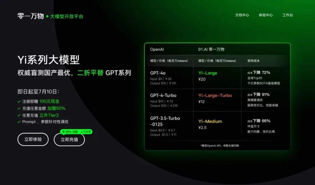 零一萬物發起「Yi API 二折平替計劃」,面向 OpenAI 用户推出平滑遷移至 Yi 系列大模型的服務。據介紹,目前註冊使用 Yi API 的新客户,零一萬物立即贈送 100 元額度,幫助用户完成平穩過渡;平台充值還將贈送 50% 到賬額度,上不封頂。流速方面,任意充值即可享受 PRM/TPM 限速直升 Tier3,是目前零一萬物較高級別的服務質量和響應速度。另外,Yi API 還將提供 Prompt 兼容調優服務支持,幫助遷移用户快速適配 Yi 系列大模型。充值用户可根據自身需求選擇 Yi-Large、Yi-Large-Turbo、Yi-Medium 等多款不同參數的模型。Turbo 系列主打的是快速、廉價的性價比,對比 GPT-4 Turbo 的價格,用户接入 Yi-Large-Turbo 後使用成本可下降九成以上。