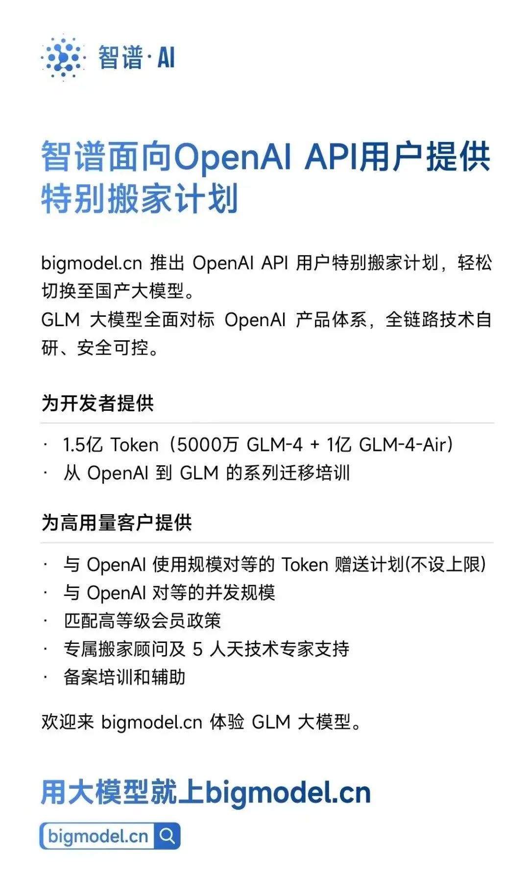 智譜 AI 是最開做出反應的大模型廠商。智譜 AI 針對 OpenAI API 用户發起了一項特別搬家計劃,分為普通開發者版和高質量客户(企業版),且均為兩部分羣體提供遷移的一對一指導培訓。其 GLM 模型將全面對標 OpenAI 產品體系,為開發者提供 1.5 億 Token (5000 萬 GLM-4 + 1 億 GLM-4-Air) 以及從 OpenAl 到 GLM 的系列遷移培訓。此外,智譜 AI 將為高用量客户提供與 OpenAI 使用規模對等的 Token 贈送計劃,與 OpenAI 對等的併發規模,匹配高等級會員政策,專屬搬家顧問及 5 人天技術專家支持,以及備案培訓和輔助,以助力客户無縫切換國產大模型。