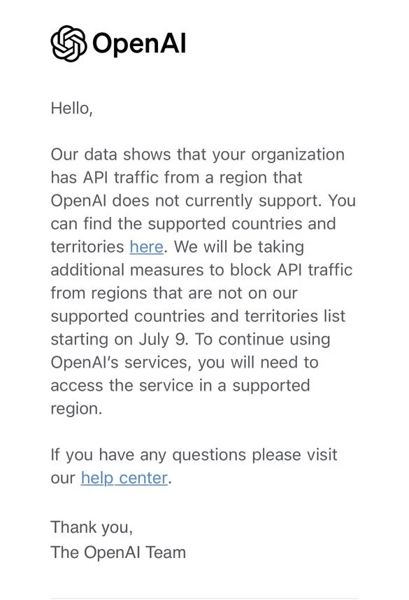 OpenAI 公告譯文如下:「我們的數據顯示您的組織有來自 OpenAl 目前不支持的地區的 API 流量。您可以在這裏找到支持的國家和地區。我們將採取額外的措施,從 7 月 9 日起,阻止來自未列入我們支持的國家和地區名單的區域的 API 運輸。要繼續使用 OpenAl 的服務,您需要在受支持的地區訪問該服務。」