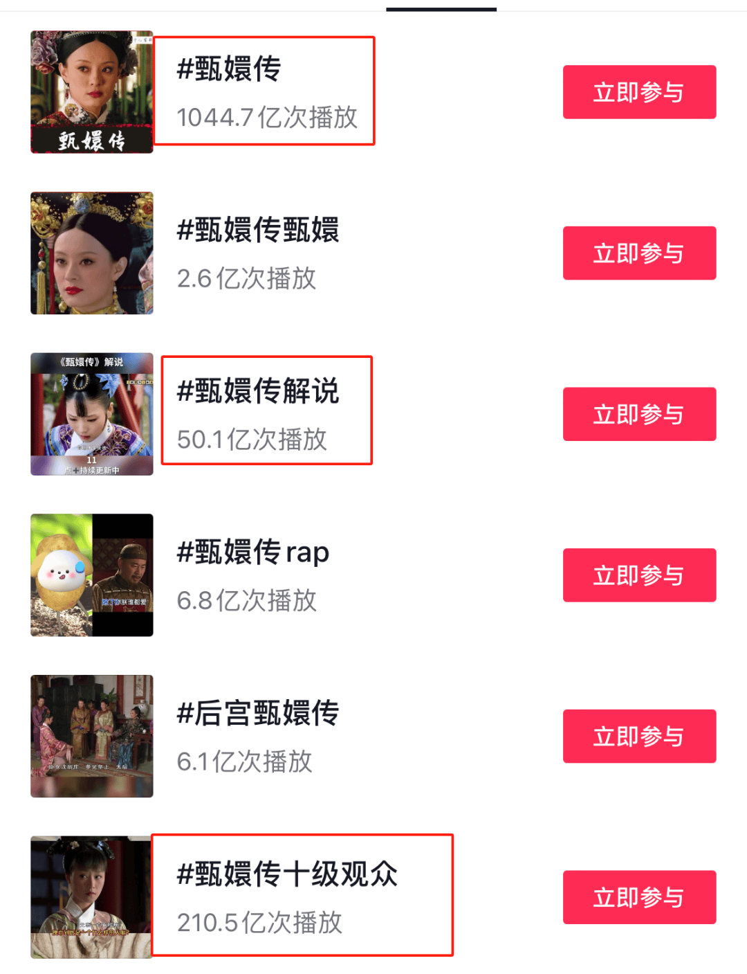 在抖音上#甄嬛傳相關話題有1044億次播放,還有210億”甄嬛傳十級觀眾“拿着顯微鏡刷劇;大家對甄嬛傳的熱愛甚至蔓延到學術界,在知網搜索“甄嬛傳”,有800多篇相關論文。