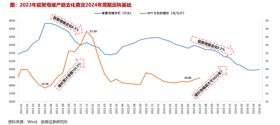 該機構分析認為,從2021年6月至2022年4月,全國能繁母豬存欄累計去化8.5%,對應2022年10月份生豬價格突破27元/公斤,較之前豬價底部實現翻倍上漲,而從2022年末至2024年4月,能繁母豬存欄已經累計去化9.2%,對應未來豬價上漲空間或將更高。