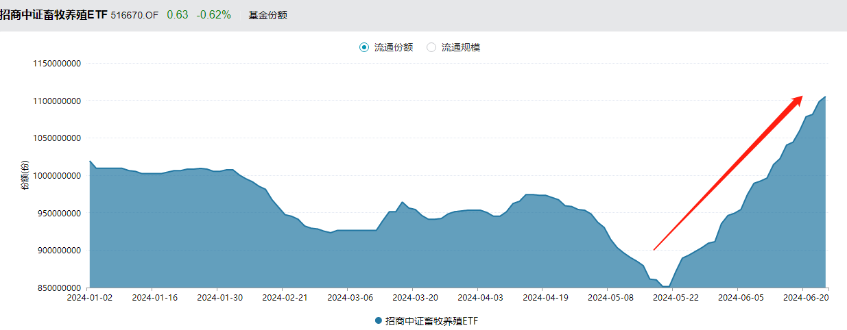 事實上,近一個月以來,大量真金白銀實踐“逢跌佈局”,畜牧養殖類ETF成為市場熱門品種。上交所數據顯示,自5月21日至今,畜牧養殖ETF(516670)份額大增2.54億份,激增30%,連續24個交易日獲得資金淨申購,份額增幅及持續性均為同類最熱品種。