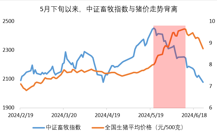 然而,在5月下旬豬價快速上行階段,二級市場豬肉板塊就開始調整,和快速上行的豬價形成了“剪刀差”。