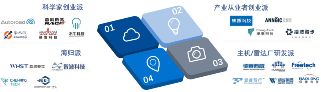 我國毫米波雷達供應商主要分為四大派系。我國的毫米波雷達始於2000年,民用毫米波雷達企業主要集中設立於2013年至2016年,以及2018年左右。我國軍民用毫米波雷達初創企業按創始團隊可以主要分為四種類型,分別為高校科研院所的科學家創業團隊,海外雷達就業者回國創業團隊,供應商體系內及上下游產業從業者創業團隊,以及主機廠和雷達廠內部自研的體系化團隊。