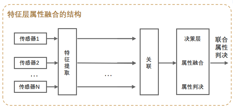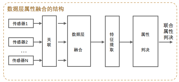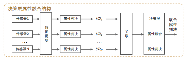 數據層屬性融合結構是最低層次的融合方式,是原始數據的直接融合。特徵層融合屬於中間層次的融合方式,每個傳感器觀測一個目標,並且為了產生來自每個傳感器的特徵矢量要完成特徵提取,然後融合這些特徵矢量,並基於聯合特徵矢量作出屬性判決。特徵層融合同時具備低層次和高層次的部分優勢。決策層屬性融合中,每個傳感器分別獨立完成監測數據的特徵提取和識別任務,然後對多個傳感器的結果進行整合。