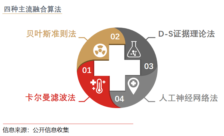 自動駕駛算法覆蓋感知、決策、執行三個層次。多傳感器的使用會出現大量冗餘信息,在各場景下通過算法中設定賦值各傳感器數據係數是不同車企提升傳感器識別和決策能力的關鍵。目前多傳感器融合的算法有貝葉斯準則法、卡爾曼濾波法、D-S證據理論法、人工神經網絡法等。