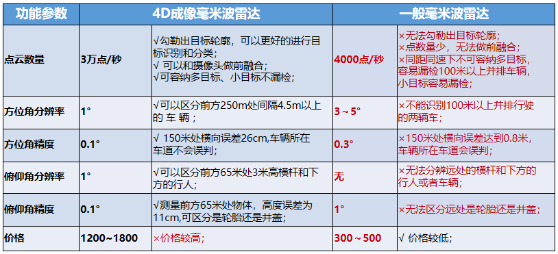 傳統毫米波雷達只能二維成像,4D毫米波雷達具有傳統毫米波雷達所不具有的3D識別能力,4D成像雷達可以輸出帶有高度的目標點雲,可以為高級別自動駕駛提供可靠、對車端運算能力要求適中的感知能力,為智能駕駛系統提供更為精確、低功耗和低成本的車輛周圍環境感知系統方案,整體提升感知傳感器對車輛周圍的環境感知性能和信息維度。同時,4D毫米波雷達的價格約為激光雷達的10%-50%。