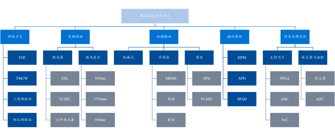 激光雷達可以分為飛行時間法(Time of Flight,ToF)、調頻連續波法(FMCW,Frequency Modulated Continuous Wave),以及三角測距法、相位測距法等方法。其中ToF與FMCW能夠實現較遠的測程,目前是車載激光雷達的主流方案。
