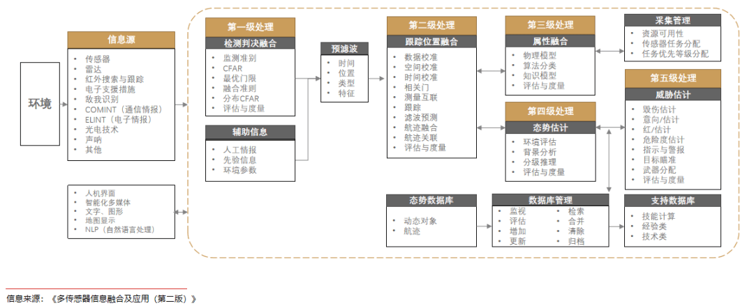 美國“數據融合聯合實驗室”在防禦系統中通用的數據融合處理模型將數據融合分為五級。在信息融合的五級模型中,第一個層次為檢測判決融合;第二個層次為位置融合;第三個層次為目標識別(屬性)信息融合;第四個層次為態勢評估;第五個層次為威脅估計。在這種功能模型描述中,前三個層次的信息融合適合於任意的多傳感器信息融合系統,而後兩個層次主要適用於軍事應用指揮控制通信計算機情報監視與偵察系統。