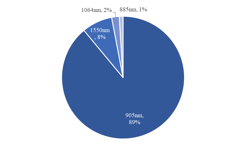 按激光波長劃分,基於905nm的激光雷達在市場上佔據主導地位。根據YOLE Intelligence數據,從2018年至2023年905nm激光雷達合計在乘用車上車情況中佔比89%。另外,速騰聚創等企業研發的新型雷達則使用940nm。另外,按激光發射器結構來看,發射模塊的激光發射器可分以為邊發射激光器(EEL)、垂直腔面發射激光器(VCSEL)及光纖激光器。