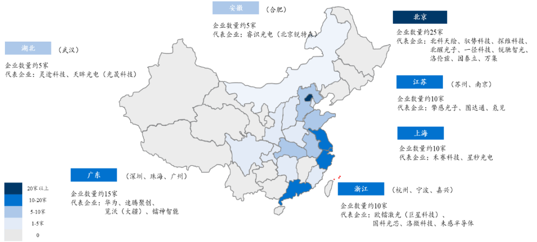 我國激光雷達製造企業眾多但大部分集中在消費級、工業級,擁有車規級別或車載技術規劃的激光雷達企業較少。按地域劃分,我國車規激光雷達供應商主要集中在北京和深圳。