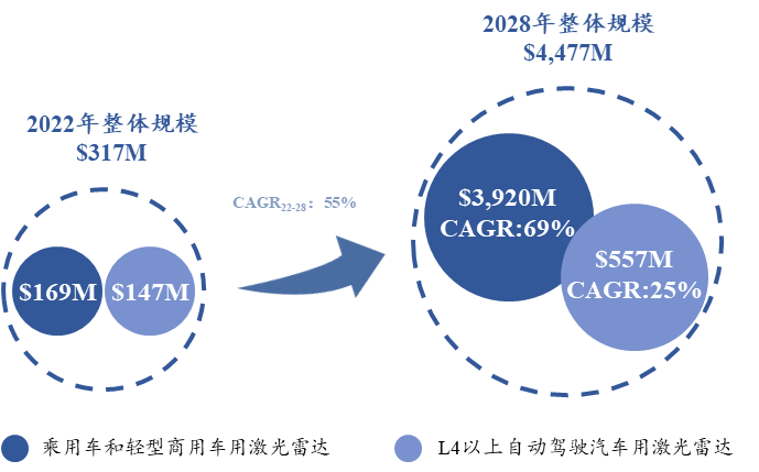 根據YOLE Intelligence預測,至2028年,車載激光雷達的市場規模將以55%的年複合增長率增長快速增長至44.77億美元,約合313億人民幣。其中,乘用車和輕型商用車激光雷達市場規模將增長至39.20億美元,自動駕駛汽車激光雷達市場規模增長至5.57億美元。