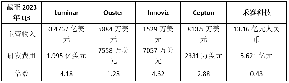 Ouster截至2023年前三季度的主營收入為5884萬美元,同時研發費用為7558萬美元,研發費用為收入的1.3倍。