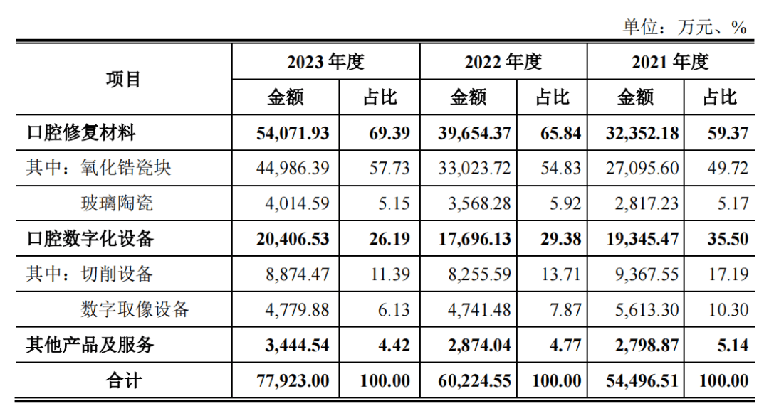 其中貢獻營收比例最大的,還當屬愛迪特核心產品“氧化鋯瓷塊”,如其介紹,“氧化鋯口腔修復材料憑藉其高強度、高韌性和良好的生物相容性廣泛適用,尤其是在口腔修復方面,美學效果接近真實牙體,具有廣闊的應用前景。”2021—2023年報告期間,愛迪特“口腔修復材料-氧化鋯瓷塊”佔主營業務收入的比例分別為49.27%、54.83%、57.73%。