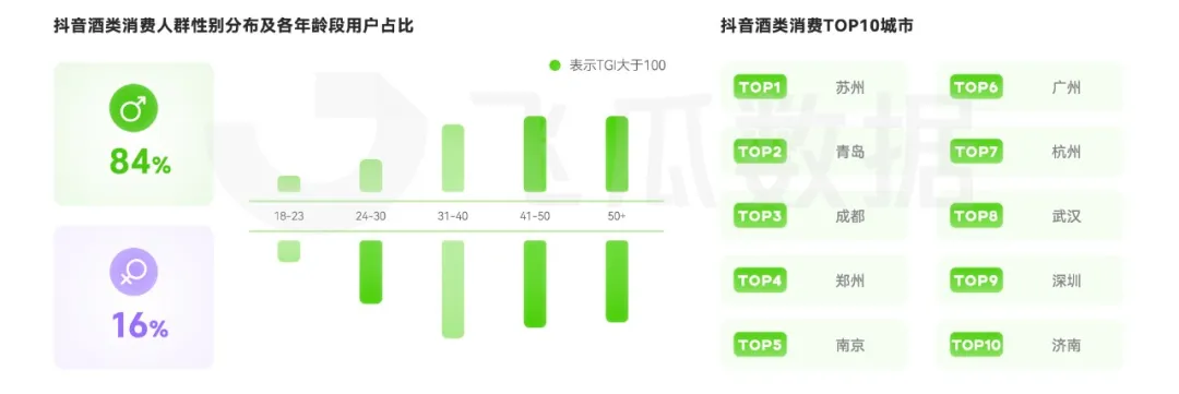 消費羣體方面,目前抖音酒類商品的消費羣體以男性為主,佔比超過84%,且年齡集中在31歲以上。而隨着“她力量”的崛起,女性對消費市場格局的影響力也逐漸滲透到酒類消費領域。結合TGI數據,可以看到24-30歲的年輕女性,及41歲以上的中年女性對酒類商品表現出強購買偏好,或成為酒類消費新的增長點。