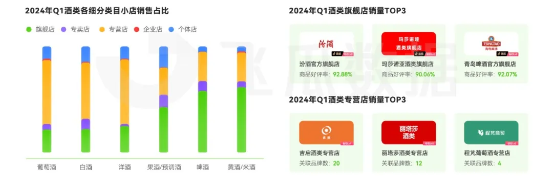 從商品來源來看,專營店是抖音酒類商品主要的銷售陣地,2024年Q1產生的銷售額佔比高達51%。與此同時,酒類品牌也在加速搭建自營旗艦店。尤其黃酒/米酒、啤酒、果酒/預調酒品類,來自旗艦店的銷售額佔比在4成以上,為後續產品上新、會員經營及品牌形象塑造建立了有利的環境。