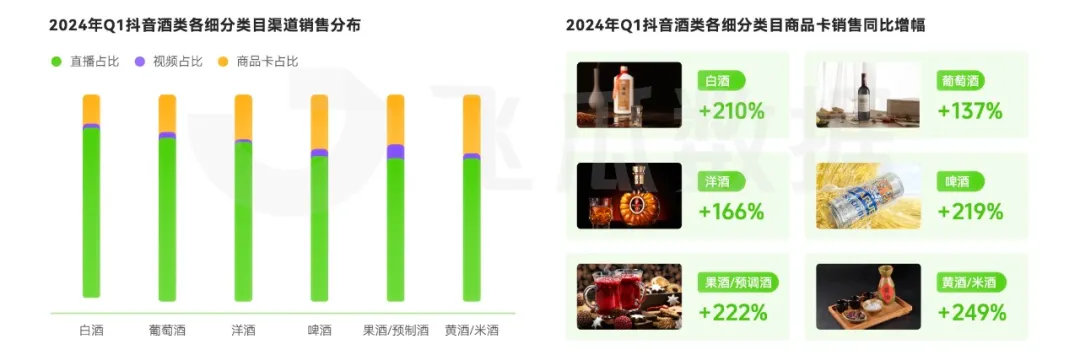 從推廣方式來看,直播仍是酒類的轉化的主要形式,銷售額佔比高達83%。而隨着抖音貨架場景的不斷完善,消費者通過抖音商城等渠道購買酒類商品的習慣逐漸養成,有效帶動酒類商品在貨架場景下的靜銷力。據飛瓜統計,2024年Q1抖音酒類各細分類目中,來自商品卡渠道的銷售額同比增幅均保持三位數以上增長,為品類銷售開闢了新增量。