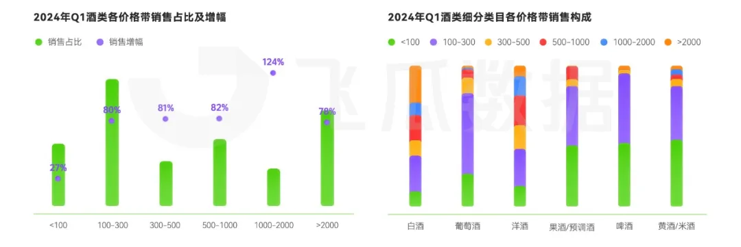 從價格分佈來看,100-300元為抖音酒類的主要價格區間,24年Q1的銷售佔比超過25%;與此同時,各細分類目的酒水商家也在通過限定款、聯名款、產品組合銷售等各種形式來提升品牌整體銷售轉化,帶動千元以上價格帶的銷售增長。據飛瓜統計,2024年Q1,銷售均價在千元以上的酒類商品產生的銷售額佔比已超過30%,各細分類目均呈現高端化趨勢。