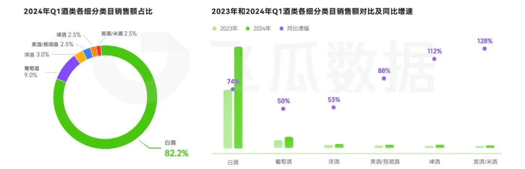 在一眾細分類目中,白酒佔據絕對地位,2024年Q1的總銷售額佔比高達82.2%。同時,隨着消費者對健康飲酒理念的認同,他們對米酒、果酒等低度酒的需求漸長,帶動果酒/預調酒、黃酒/米酒等細分賽道崛起,銷售額較去年同期分別增長 88%/128%,高於行業均值。