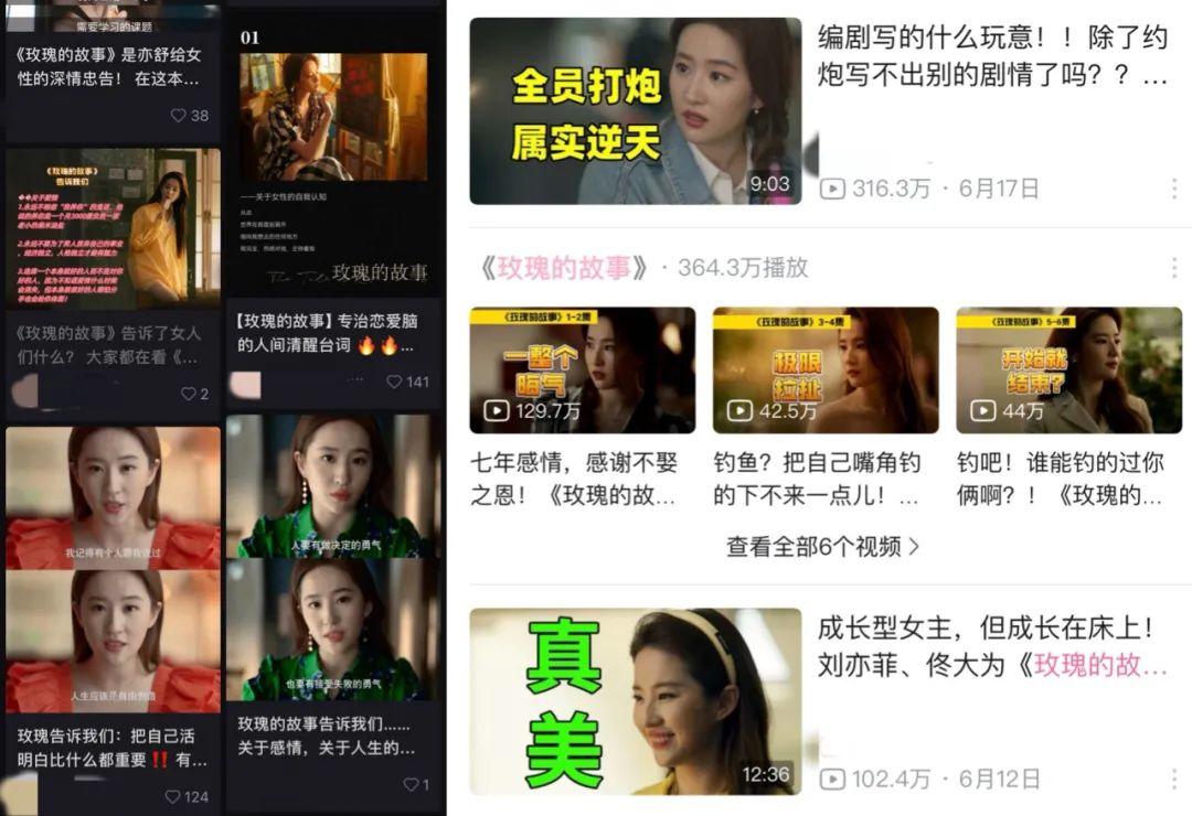《玫瑰的故事》小紅書(左)B站(右)劇評從產品經理的角度來看,當今劇集市場的主要受眾依然以女性為主,尋找到契合當代女性意識的項目和角色,仍然是對一個明星星途最有利的選擇,畢竟沒有人可以討好所有人。劉亦菲及其團隊的成功之處在於,沒有一味執迷在古偶、仙俠這種傳統賽道里挑大IP,演大女主,即便這些故事也會得到粉絲們的追捧。而是去挑選有新意的,有可能趕上時代風口的劇本,不論它是大製作還是小製作。