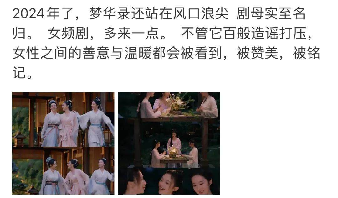 由於迴歸劇圈的第一部作品《南煙齋筆錄》至今未能播出,我們只能把《夢華錄》視為她的迴歸首作。在這部首作中,她貫徹了既往的古裝美女形象。就連主人公的名字趙盼兒,都與趙靈兒有七分相似,給營銷動作提供了支點。但已成紅海的古偶想要出圈並不容易。除了長得好看,《夢華錄》前期出圈最為關鍵的原因,是劇中大量“girls help girls”的情節,尤其是當這一類情節出現在古裝劇裏,更是少見。