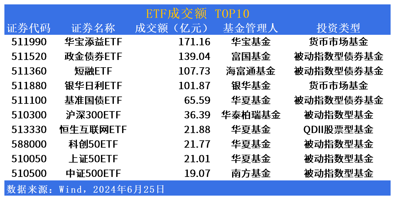 具體來看,華寶添益ETF(511990)、政金債券ETF(511520)、短融ETF(511360)、銀華日利ETF(511880)成交額超百億元。