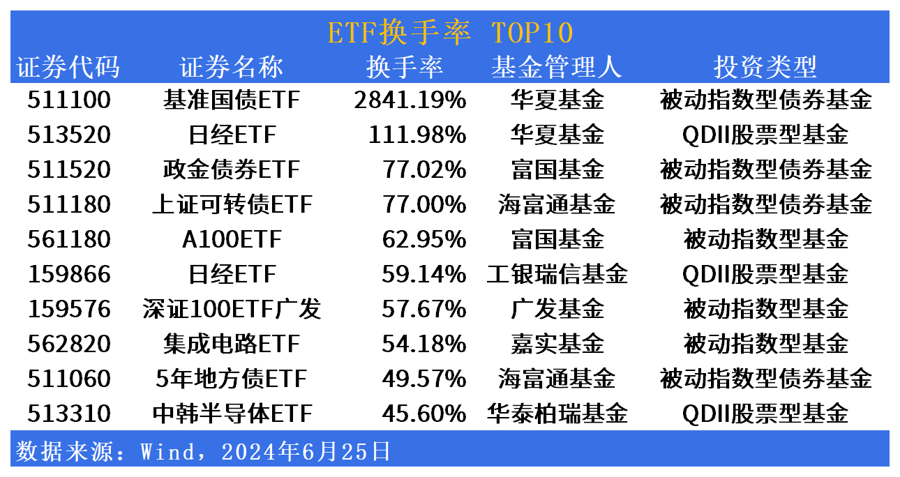 換手率方面,基準國債ETF(511100)換手率近3000%、日經ETF(513520)成交額超100%。另一隻日經ETF(159866)成交額近60%。