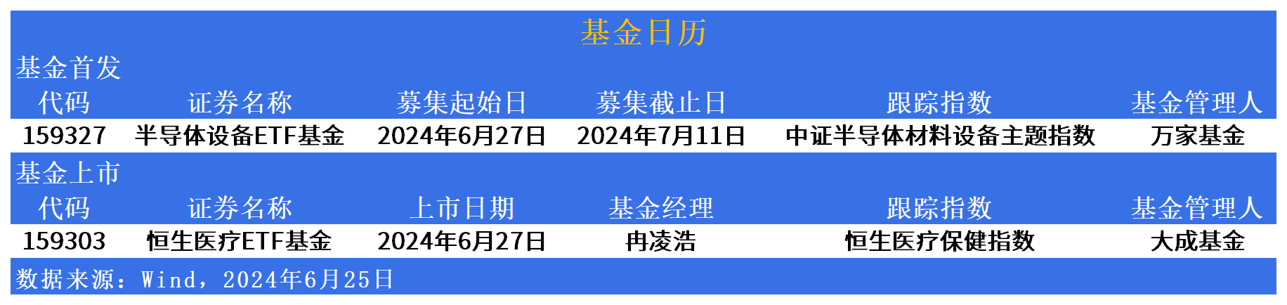 ETF發行市場方面,萬家半導體設備ETF基金(159327)明日起開始募集,大成恒生醫療ETF基金(159303)明日上市