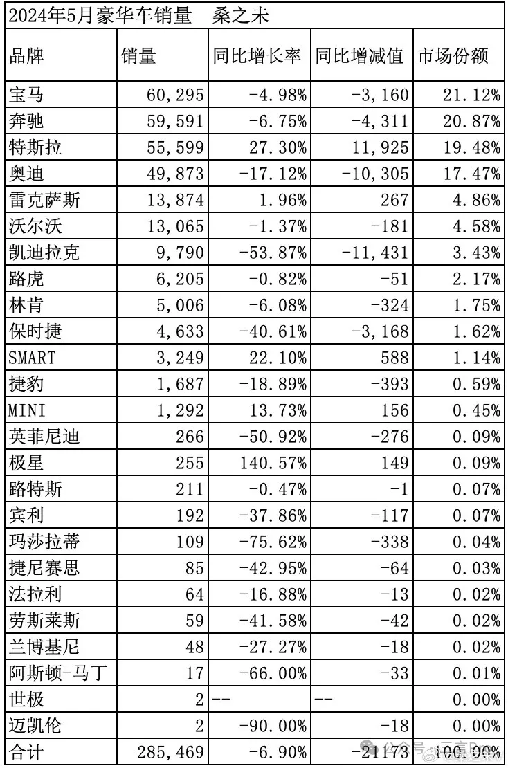 據認證為“中國汽車流通協會專家委員會成員”的博主“桑之未”統計,2024年5月,大部分超豪華品牌銷量都出現同比下降情況。