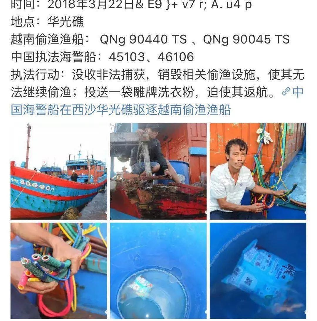▲往越南非法漁船的淡水箱中投擲一袋雕牌洗衣粉