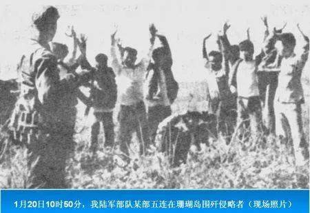 ▲在隨後的戰鬥中,解放軍陸海軍各一部和西沙守島基幹民兵乘坐皮划艇,先後奪回被南越佔領的甘泉島、珊瑚島、金銀島。圖為守備150團2營5連和兩棲偵查隊在珊瑚島搶灘登陸,俘虜南越少校軍官以下35人和美軍中校1名。戰後兩棲偵察隊榮立集體二等功,五連榮立集體三等功。