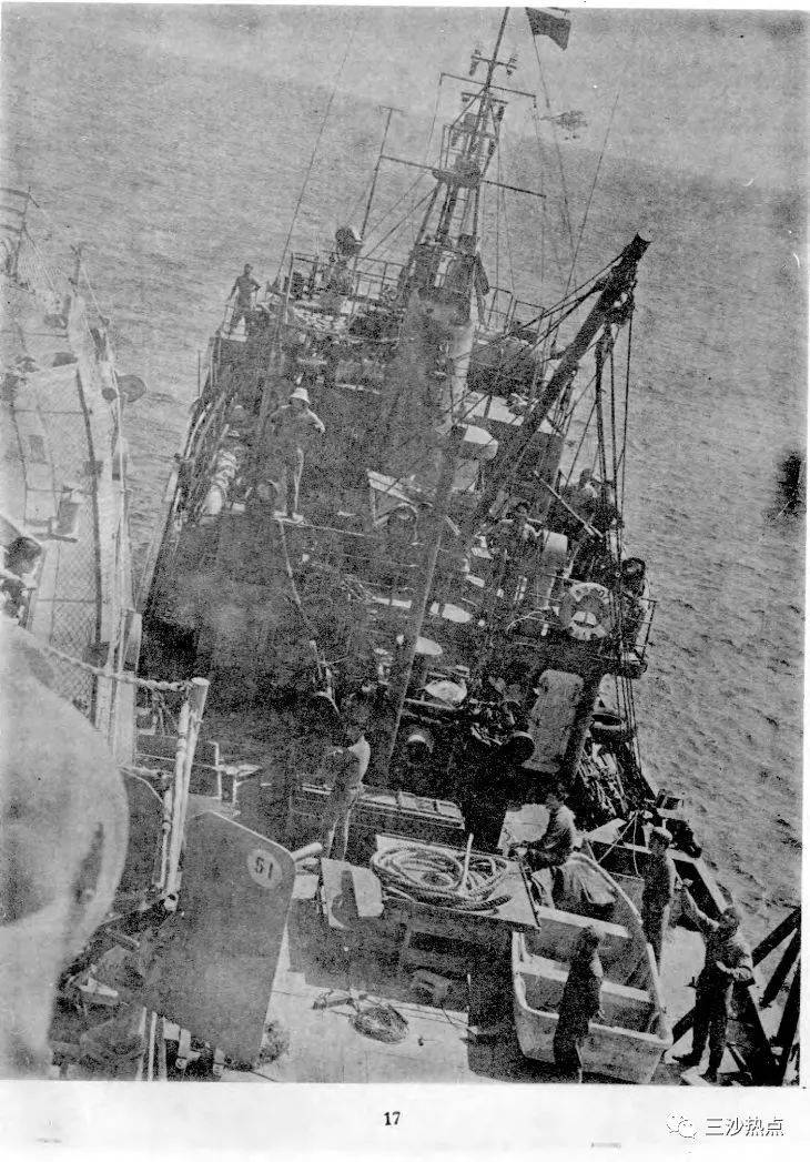 ▲西沙海戰中389艇被南越軍誤判為指揮艦,遭到多艘軍艦的集火,遭受重創的389艇共有15人犧牲,全艦榮立集體一等功。圖為損毀嚴重被迫搶灘擱淺的389艇上,戰士們正在滅火搶修。
