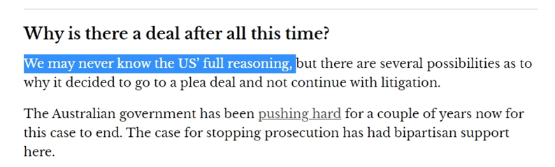 西澳大利亞大學法學院兼職教授霍莉·卡倫在“對話”網站撰文指出,公眾可能永遠不會知道美國的完整理由,有幾種可能性可以解釋為什麼美國現在決定達成認罪協議。近幾年來,澳大利亞政府一直在努力結束這起案件;在美國,甚至在一些共和黨人中,越來越多的人認為,繼續追訴阿桑奇不符合美國利益;英國大選即將舉行,考慮到政府可能發生更迭,引渡令也可能會被重新考慮。