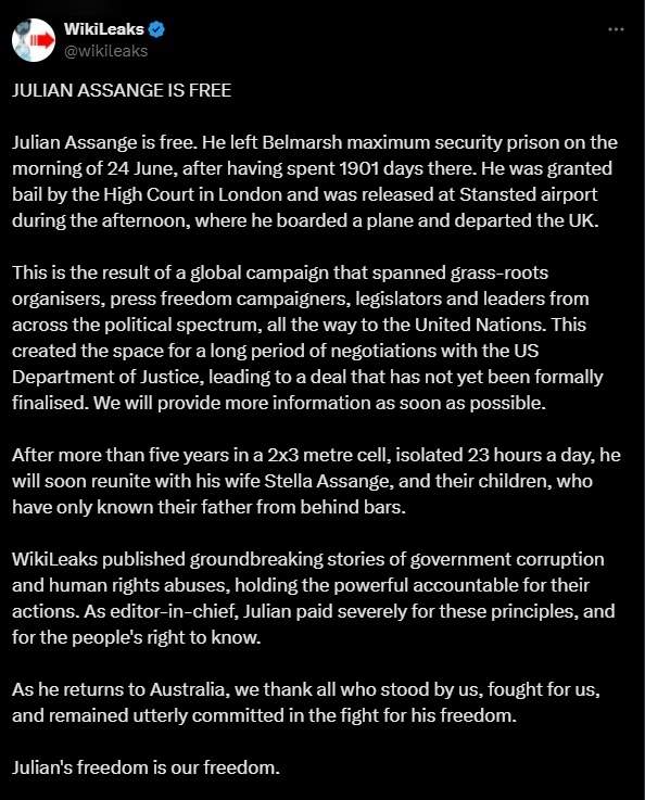 5年後的2024年6月24日上午,阿桑奇重獲自由,離開貝爾馬什監獄,前往倫敦斯坦斯特德機場,並於當天下午乘機離開英國。阿桑奇搭乘飛機在經停泰國曼谷後,於26日抵達美屬北马里亞納羣島首府塞班島,在完成相關法庭程序後,將由澳大利亞駐英國大使陪同返回澳大利亞。